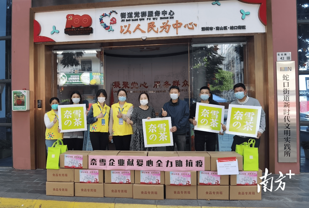 3月4日,奈雪的茶为深圳南山招商街道、蛇口街道、福田沙头街道,约30个社区的一线抗疫医护人员和社区工作者送去数千份饮品和点心等物资,向战疫一线工作人员送去暖心的关怀与敬意。