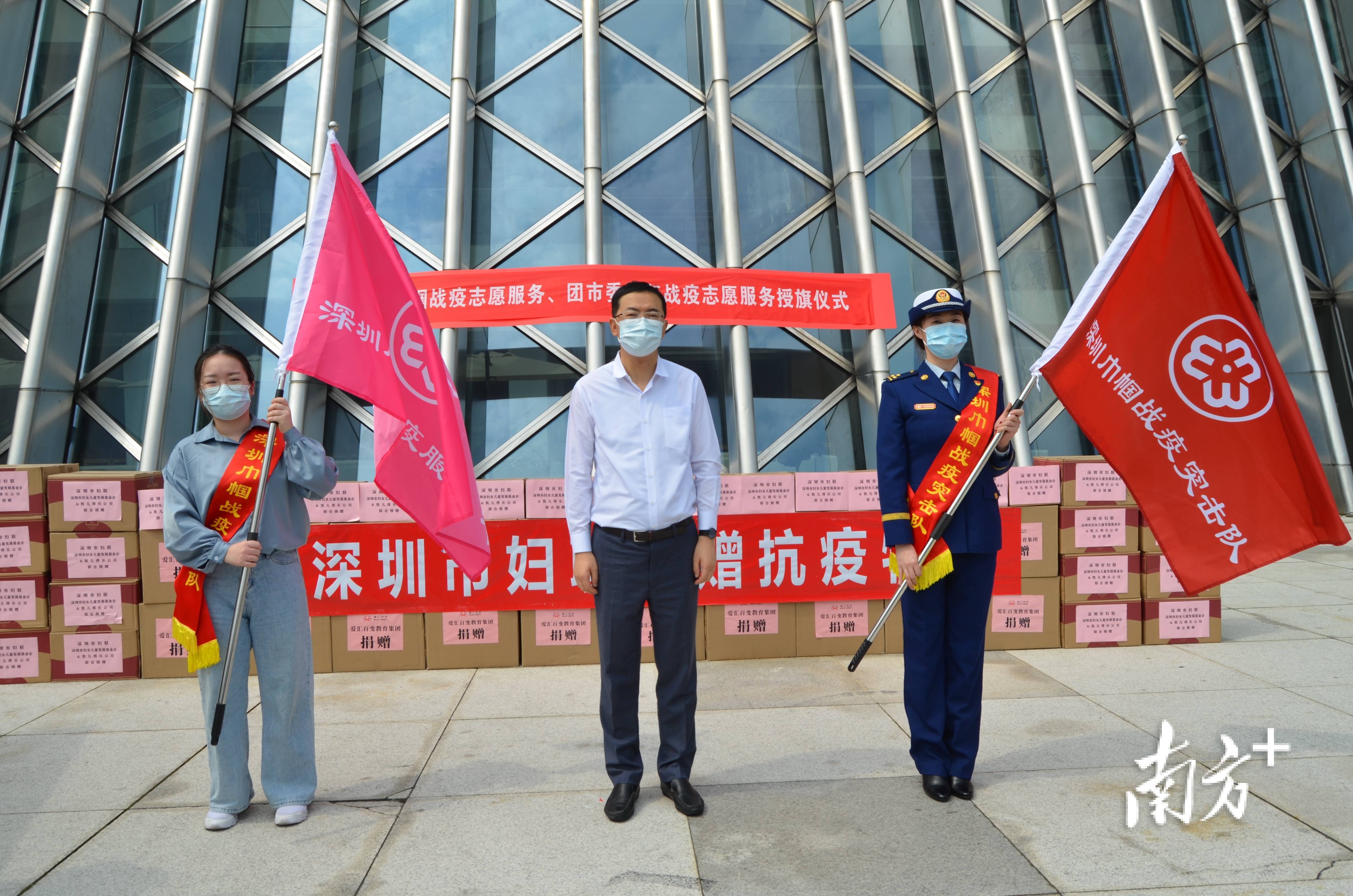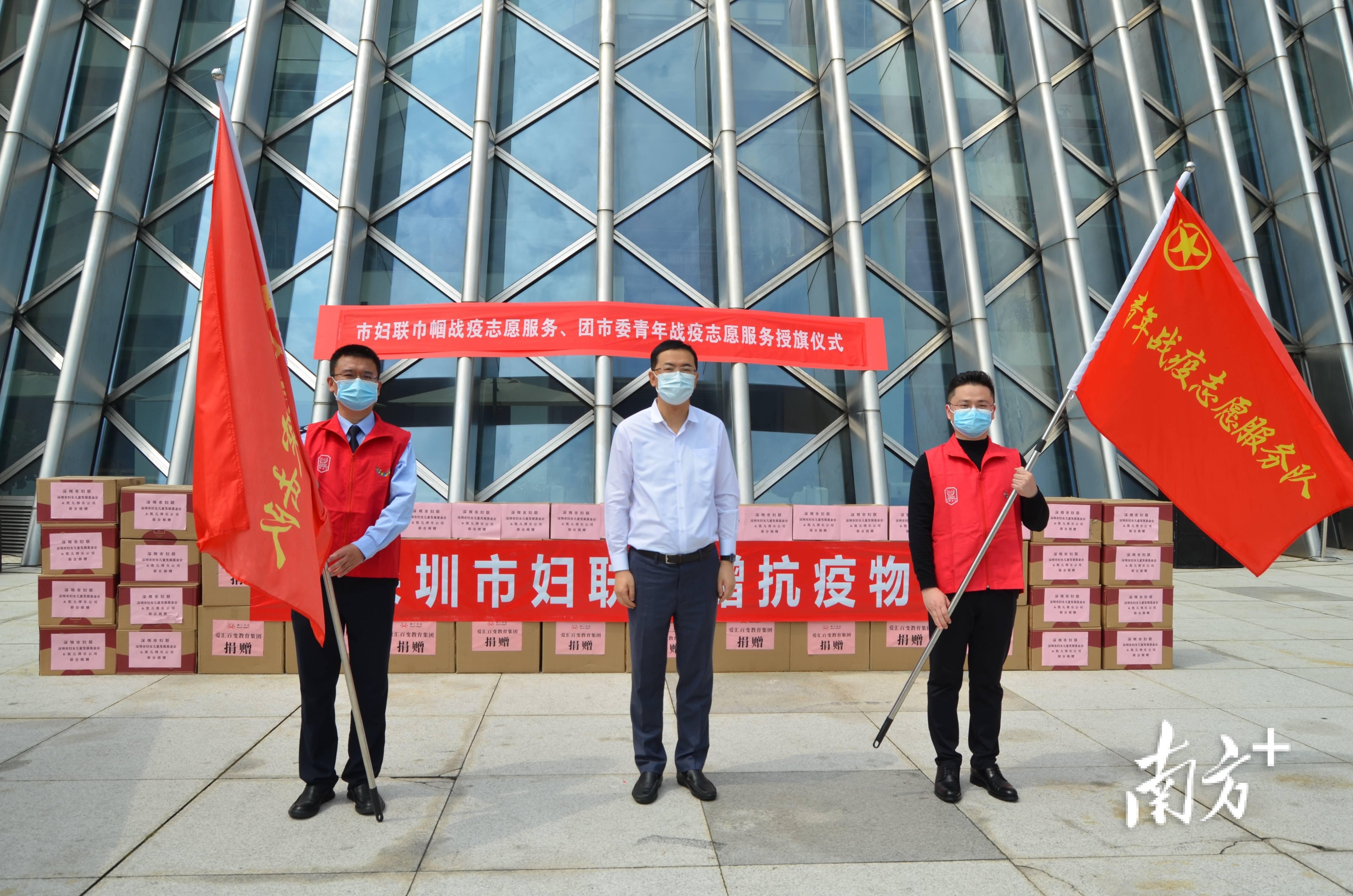 仪式上,深圳市委副书记艾学峰为巾帼战疫志愿服务队和巾帼战疫突击队以及青年战疫志愿服务队、青年战疫突击队授旗。市委副秘书长牛长涛向福田区有关代表赠送抗疫物资。巾帼志愿者代表宣读了巾帼志愿服务倡议书,团市委书记高大伟宣读了给全市志愿者的一封信。
