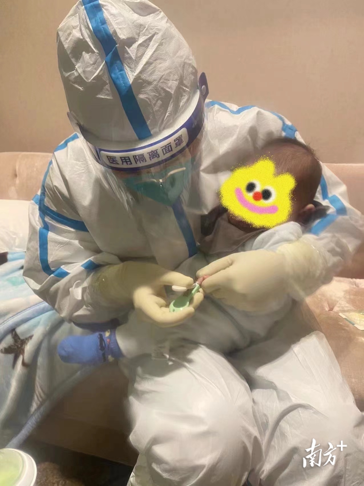 给宝墩墩洗澡同样是一大考验。2月中下旬的深圳正经历寒潮侵袭,为了不让“宝墩墩”着凉,房间里全天开着暖气,“防护服里本来就很闷热潮湿,再加上有暖气,我们常常闷到喘不过气来。”吴梦莹说。