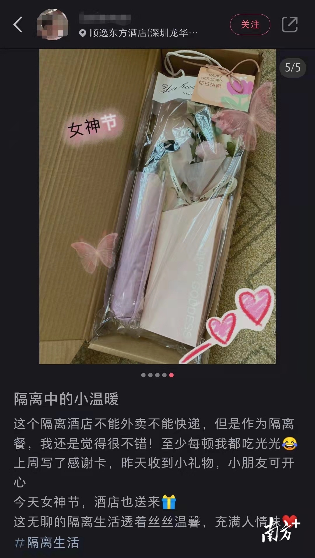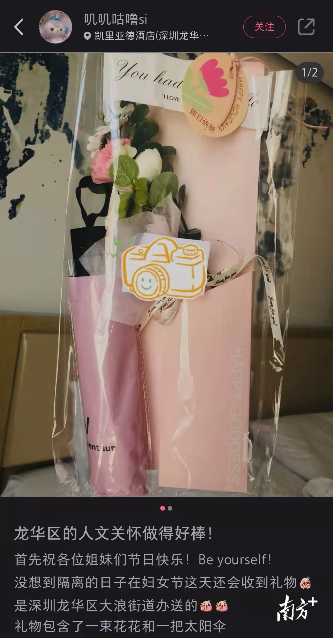 中午12点,正是吃饭的时候,住在龙华区大浪街道三家隔离酒店里的姑娘们,却收到了一份特别的惊喜。