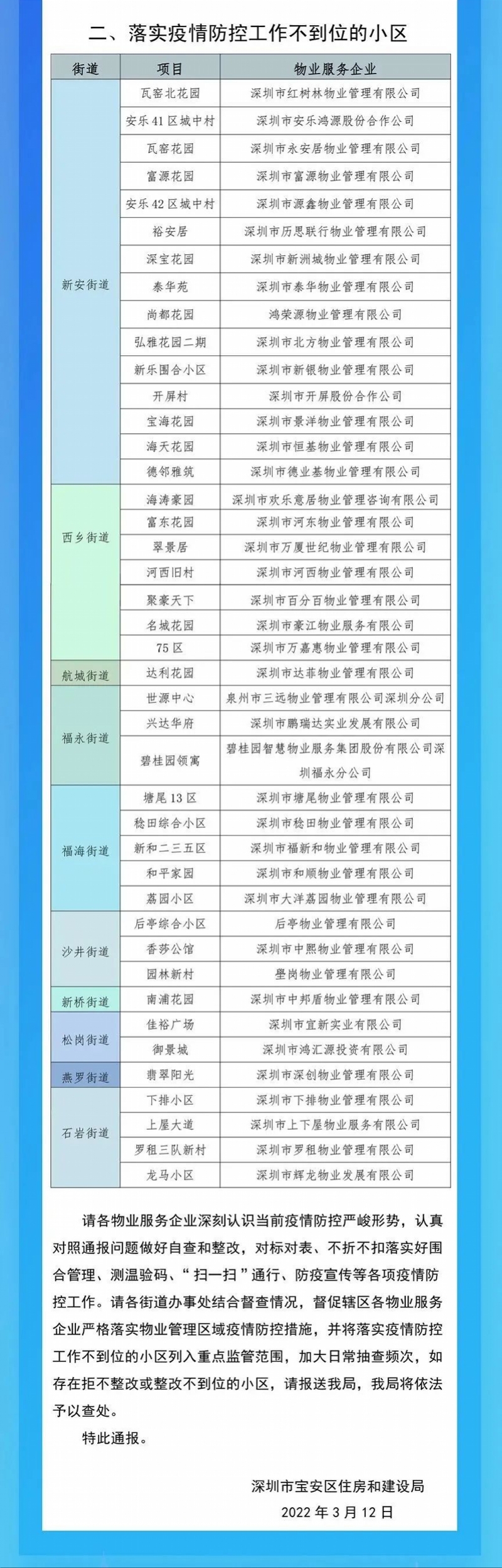 并对落实疫情防控工作不到位的小区以及物业