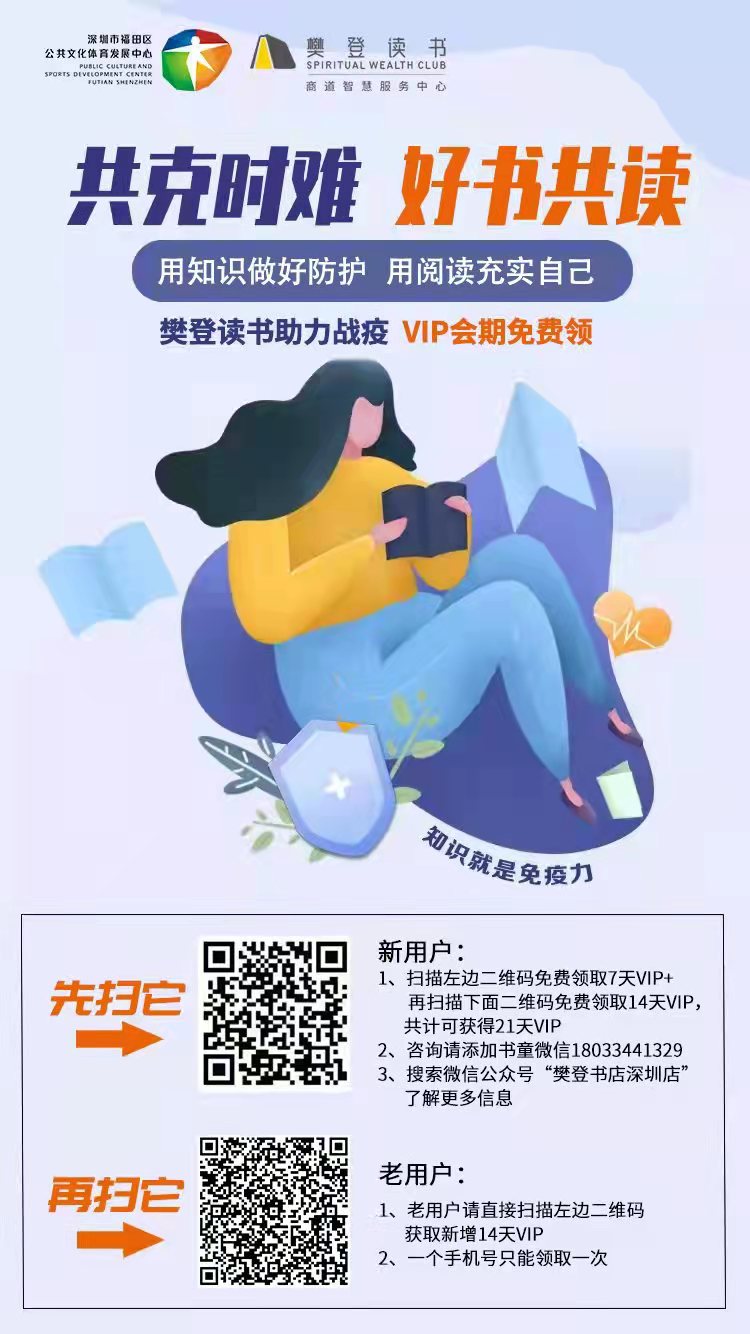 “培育心灵上的力量,以面对突然而至的情况”,阅读是人类滋养内心力量的最佳途径。前线的战“疫”,贡献的是专业和汗水。居家的战“疫”,则是一场需要内在力量来抗衡的战斗。据介绍,为了帮助市民朋友丰富居家生活,弥补线下文化活动和服务的缺失,福田区公共文体中心联合樊登读书(深圳樊登书店),向全市居民推出8万张福田文体中心与樊登读书联名书卡,陪伴大家度过7天难忘的居家之旅。有需要的市民,仅需要登录“福田文体中心”微信公众平台,扫码即可以领取。