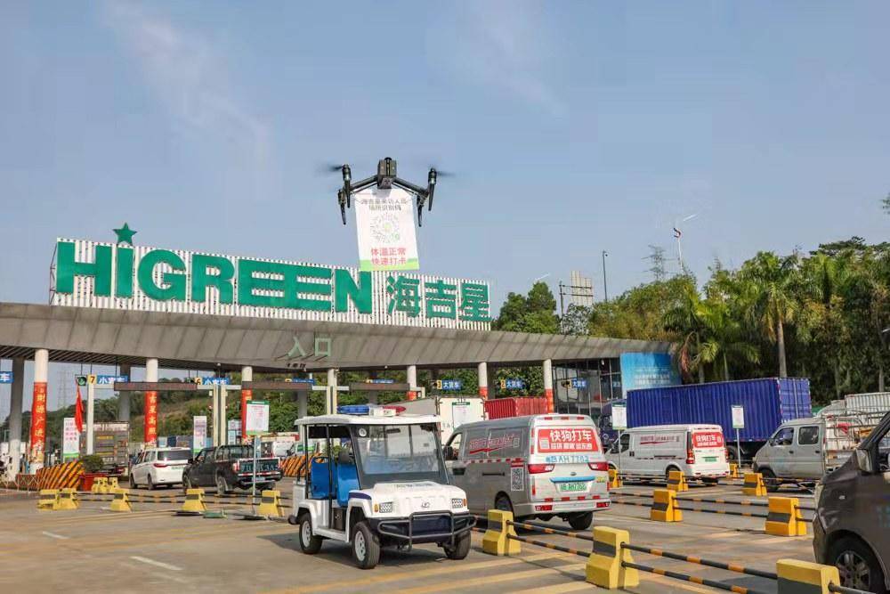 为了进一步缓解因查验措施造成的交通拥堵,在海吉星1号门入口处,一架悬挂有“场所识别二维码”的无人机低空缓慢飞行、喊话,提醒司机进行扫码打卡。深圳海吉星使用搭载喊话器、悬挂二维码的无人机协助查验工作,方便司机提前扫码,减少查验时间,提高通行效率,减轻一线防疫人员的负担;减少因查验措施造成的交通拥堵。