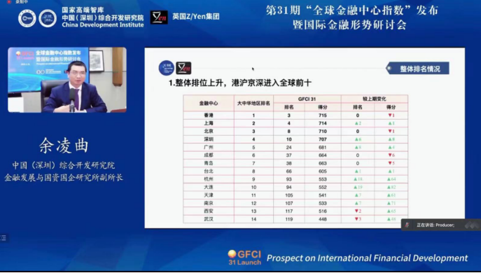 3月24日,由国家高端智库中国(深圳)综合开发研究院与英国智库Z/Yen集团共同编制的“第31期全球金融中心指数报告(GFCI 31)”在中国深圳和英国伦敦同时发布。深圳金融中心再次跻身全球前十,评分大幅增长8分,排名也提升6位。