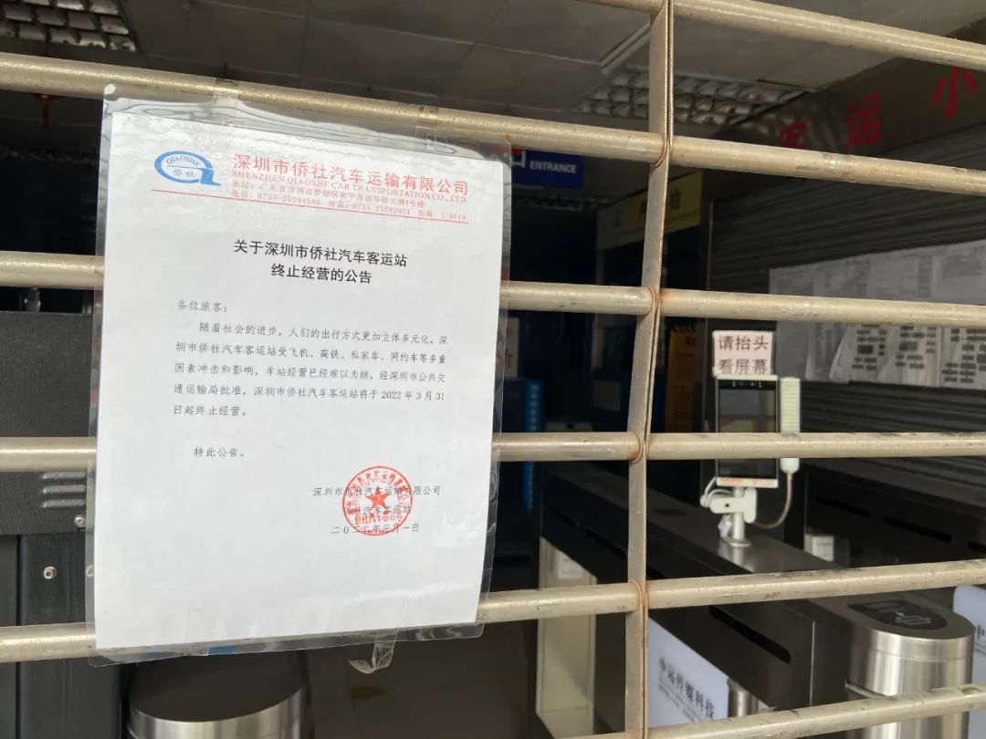 3月初,侨社汽车客运站发布终止运营公告,公告内容显示,受飞机、高铁、网约车等多重因素冲击和影响,车站运营已经难以为继,经深圳市公共交通运输局批准,深圳市侨社汽车客运站于2022年3月31日起终止经营。