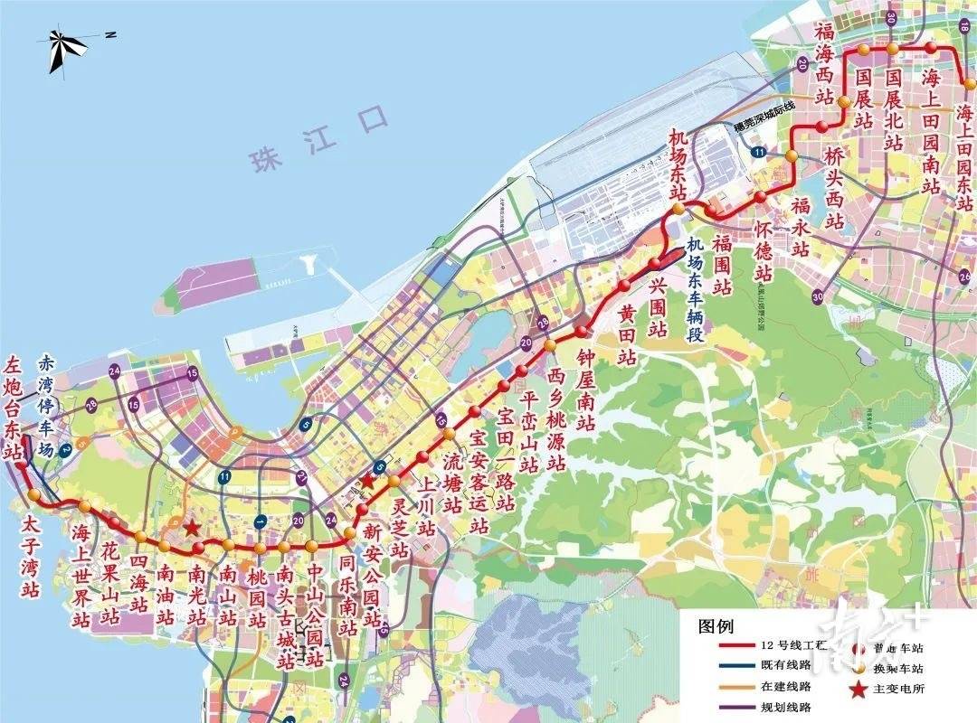 地铁12号线是深圳在建以及投入运营的轨道交通线路中站点最多、换乘最多、覆盖片区最广的全自动无人驾驶线路,是深圳市西部发展的“大动脉”。由南向北依次串联蛇口自贸区、南山中心区、前海自贸区、宝安中心区、西乡片区、机场片区、福永片区和大空港片区(新会展中心),线路全长约40.6km,全线采用地下敷设方式,12号线全线共设置33座车站,其中有18座是换乘车站。