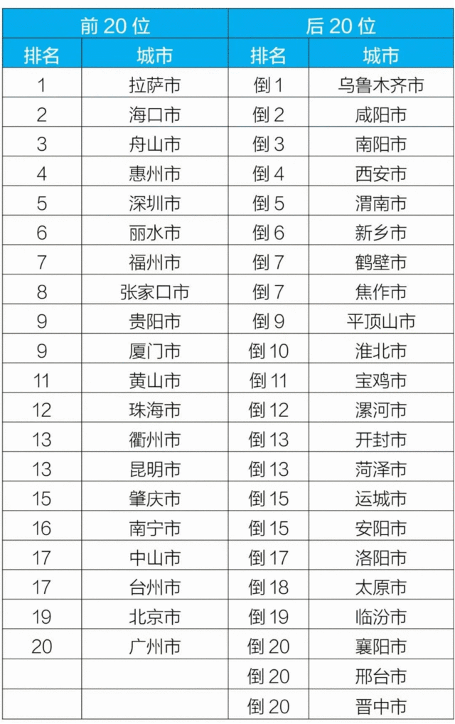 168个重点城市中,海口、拉萨、舟山等城市空气质量相对较好(从第1名至第20名);咸阳、太原和阳泉市等城市空气质量相对较差(从倒数第1名至倒数第20名)。