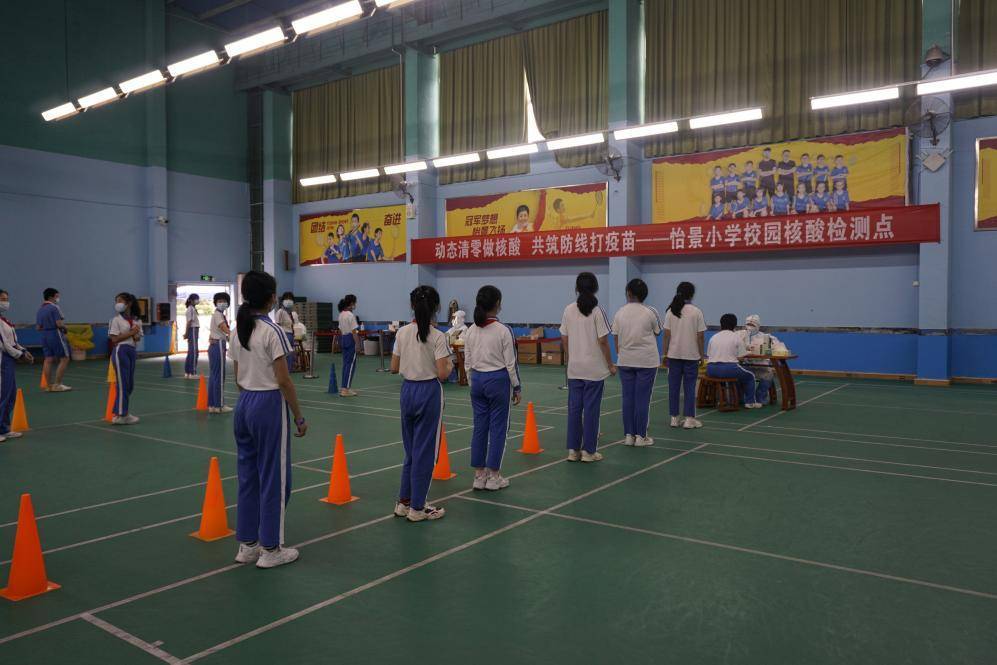 罗湖区东昌小学的体育馆内,孩子们手持学校提前打印好的核酸采样码,间隔一米,整齐有序地排队进行核酸采样;下午三点的罗湖区怡景小学内,学生们有序排队,进行核酸采样,采样完毕后,每位学生还获得了限定的怡景小学核酸纪念贴纸,仪式感十足。