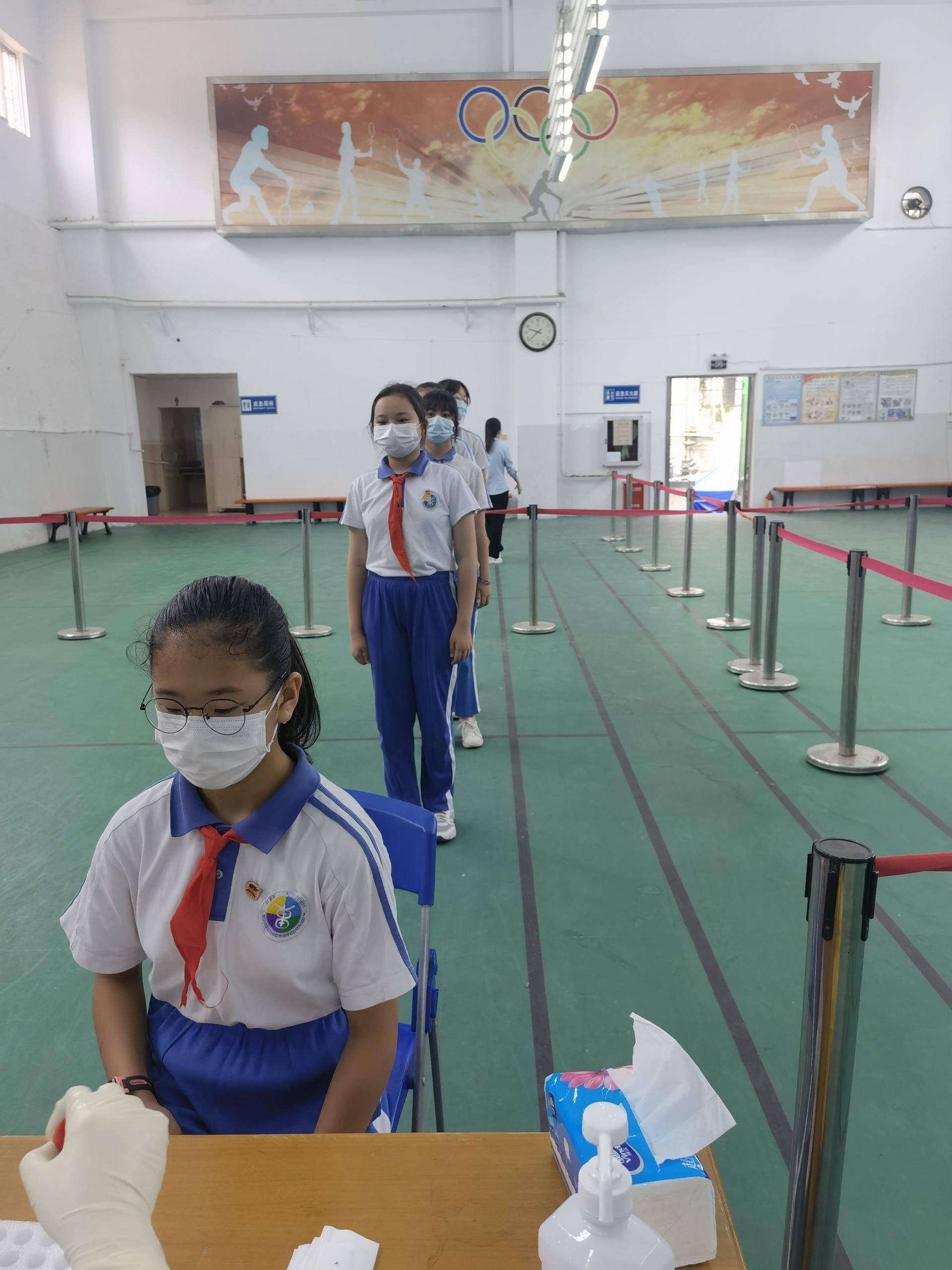 在龙岗外国语学校(集团)和美小学核酸检测点,前来做核酸的同学们每个人都戴着核酸检测二维码的胸牌,正在有序排队做核酸。全校近600名学生的胸牌是老师们用时一天赶制出来的。