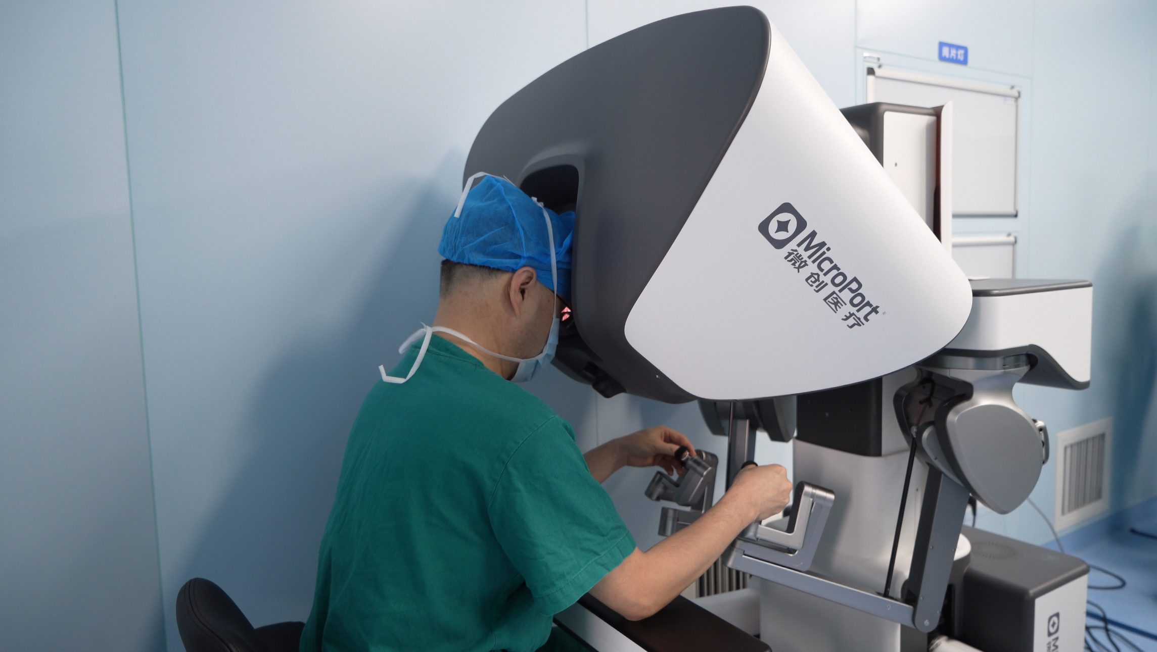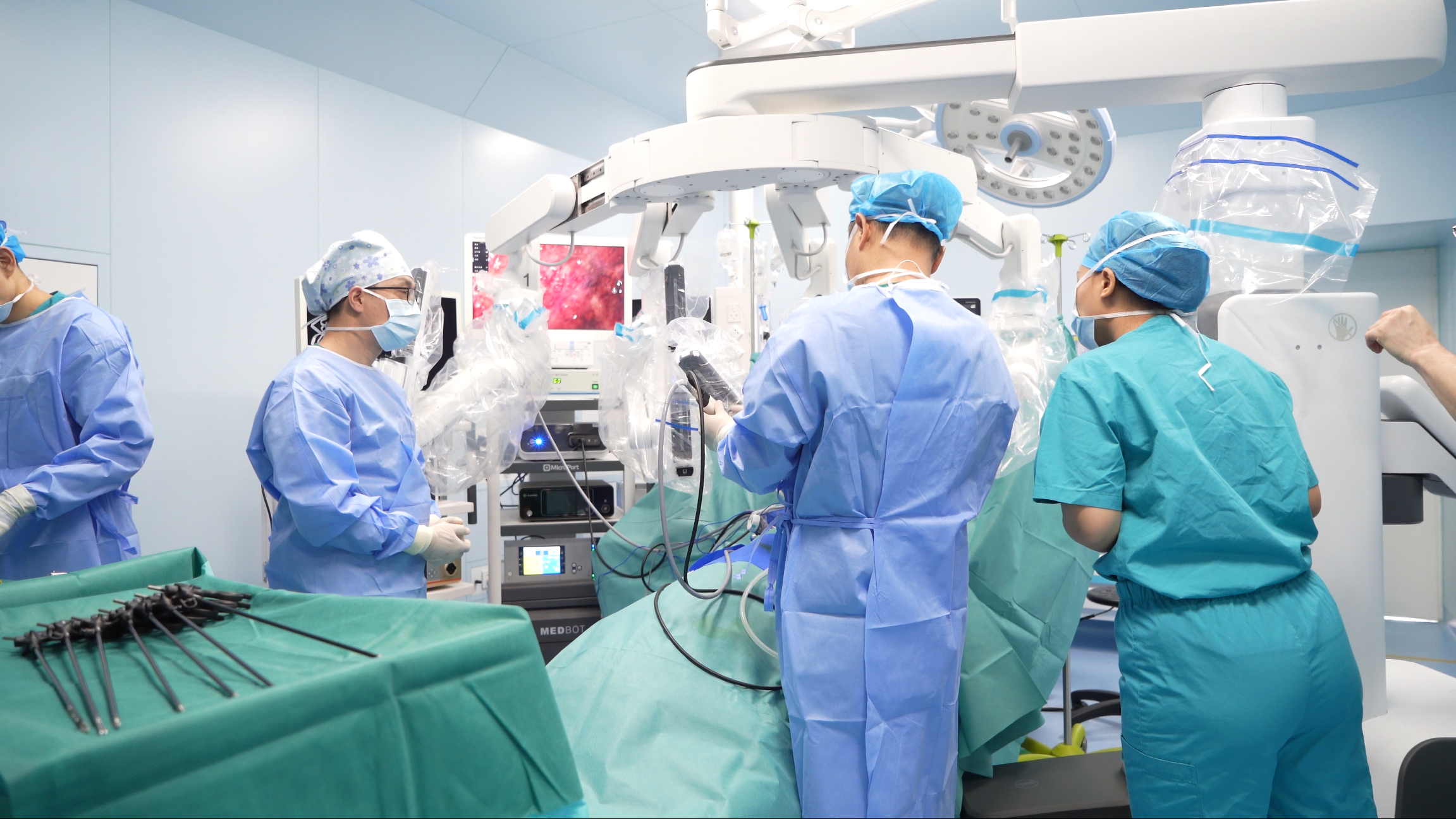 在手术台边的主控台上,医生娴熟地操作着控制系统,将“动作”精准地传导到机械臂上,将人手的灵活性和腹腔镜系统的微创优势合二为一,在狭小的空间完成精准手术操作。