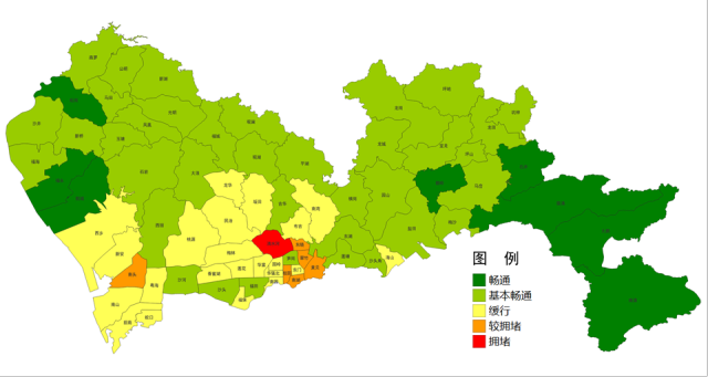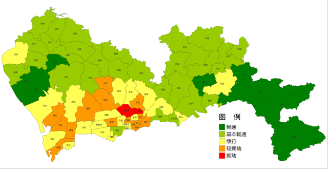 ▲普通工作日早高峰全市主要街道交通运行状态图(预测)
