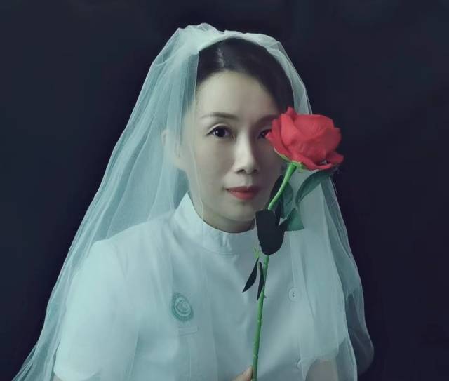 由于发热门诊的特殊,拍照的地方只能利用科室的换衣间,大家用黑布做背景,利用休息时间拍摄了这组照片。镜头里的她们,头顶圣洁白纱,身穿白色护士服,手持一支红玫瑰,巧笑倩兮,美丽温柔。