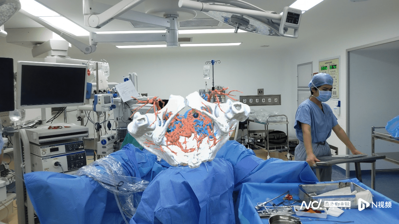 经术前综合评估,为规避导致宫腔灌流液进入体循环或血管损伤等导致病人死亡或残疾风险,除了对手术团队人员高要求外,还需要借助高科技手段-混合现实(Mixed Reality, MR)导航技术才能实现,即通过虚拟世界和现实世界无缝对接,将病人手术部位智能医学影像精准呈现在现实空间中,医生可实时观察个体化解剖观察,并适时调整手术器械在宫腔内的移动轨迹和角度,避开重要血管,保证了手术的精准性与安全性,在保留患者生育功能的同时,可降低致死致残的手术并发症。
