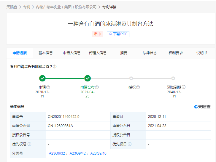 此外,2020年12月11日,内蒙古蒙牛乳业(集团)股份有限公司申请两项专利,分别为“一种冰淇淋及其制备方法”和“一种含有白酒的冰淇淋及其制备方法”。