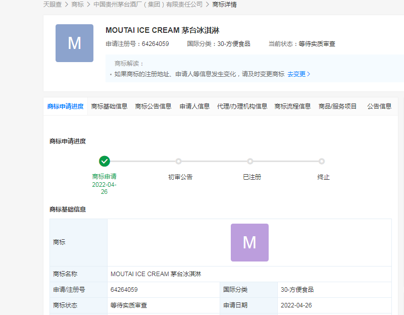 据天眼查显示,4月26日,中国贵州茅台酒厂(集团)有限责任公司申请注册商标“MOUTAI ICE CREAM 茅台冰淇淋”,目前该商标状态处于“等待实质审查”。