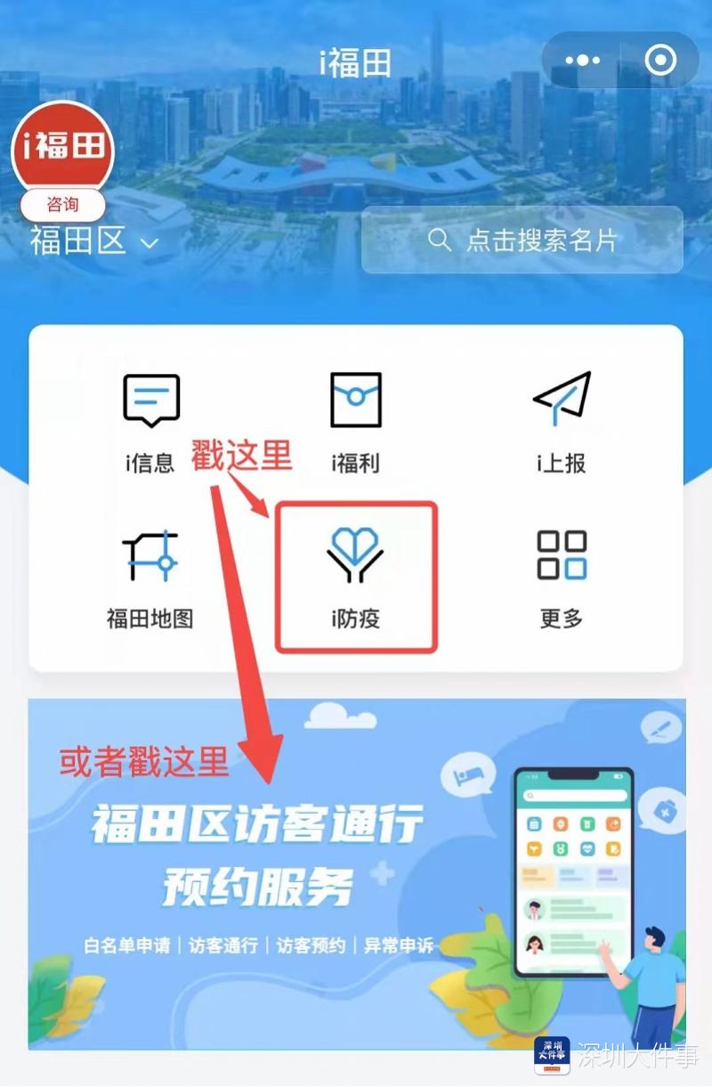 1.进入 i 福田小程序,点击 “ i 防疫”,选择 “电子哨兵综合服务”或者直接点击“福田区访客通行预约服务”图片。