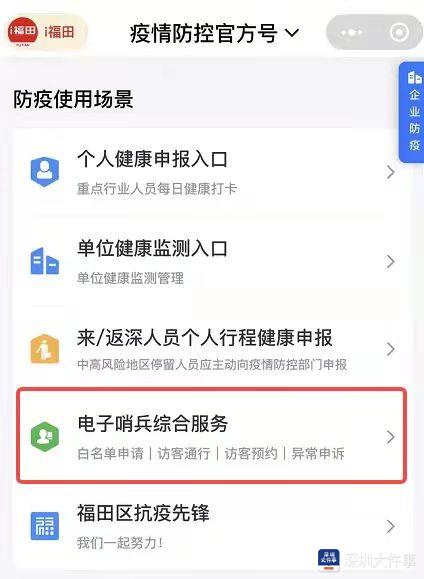 据了解,电子哨兵综合服务是i福田最新上线的一个便民服务功能,分为白名单申请、访客通行、访客预约、异常申诉四个模块。居民提前预约成功后进出福田区各大场所,只需持粤康码或身份证,卡口的电子哨兵便能快速识别通行人员的实时体温、健康码状态、核酸检测结果和疫苗接种等信息。