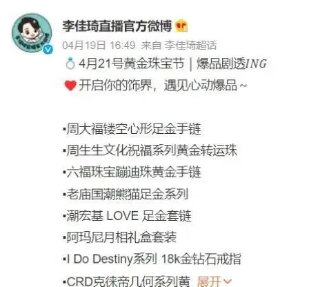 近年来,各大珠宝品牌在增加线下体验的同时,积极抢抓电商红利。淘宝一哥李佳琦此前就在直播间卖过相关的黄金货品,而也有不少散户开启了自己的抖音黄金热。