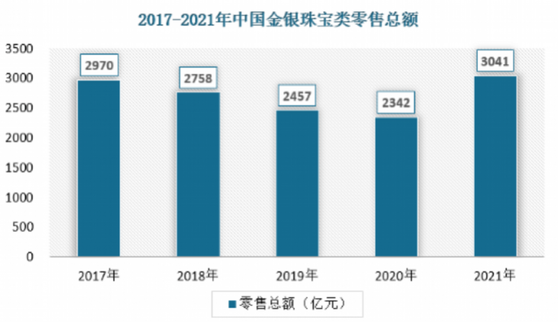 根据国家统计局公布数据,去年社会消费品零售总额440823亿元,同比增长12.50%。金银珠宝零售总额同比增速居于首位,金银珠宝零售总额为3041亿元,同比上涨29.8%。