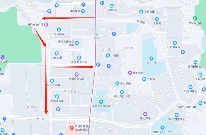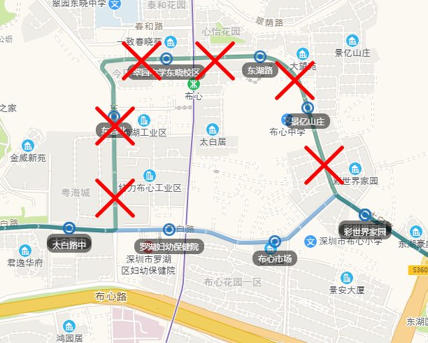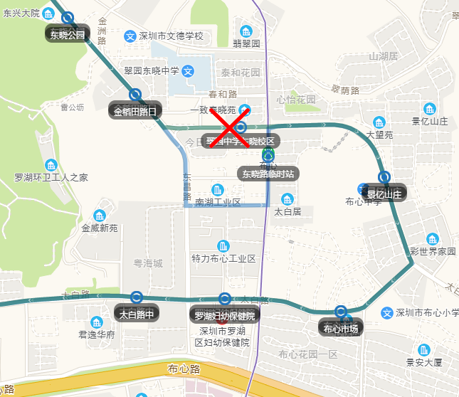 往天鹅湖公交首末站方向取消“翠园中学东晓校区(南侧)、东湖路(南侧)、景亿山庄(西侧)、布心市场(北侧)、罗湖妇幼保健院(北侧)”等5个单边公交停靠站,增加“东昌北(西侧)”1个单边公交停靠站。