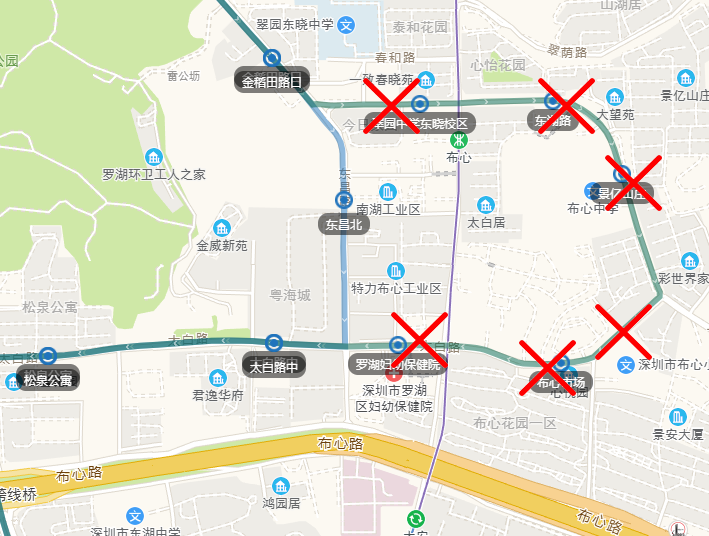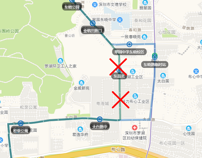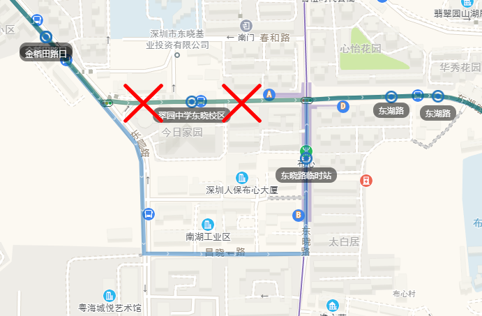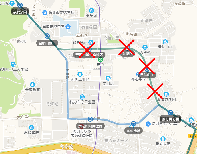 往罗湖文锦渡汽车站方向取消“翠园中学东晓校区(南侧)、东湖路(南侧)、景亿山庄(西侧)”等3个单边公交停靠站,增加“东昌北(西侧)、罗湖妇幼保健院(南侧)、布心市场(南侧)”等3个单边公交停靠站。