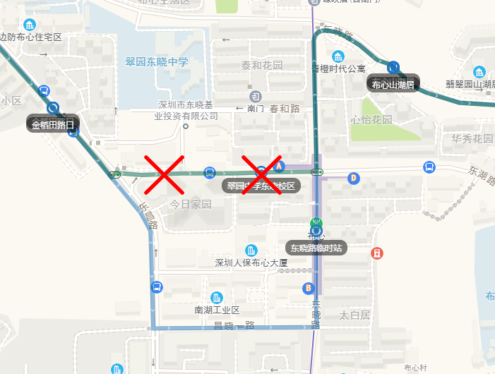 往福田交通枢纽公交场站方向取消“翠园中学东晓校区(南侧)”1个单边公交停靠站,增加“东晓路临时站(东侧)”1个单边公交停靠站。