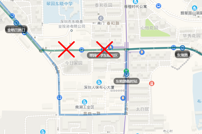 往福田高铁站方向取消“翠园中学东晓校区(南侧)”1个单边公交停靠站,增加“东晓路临时站(东侧)”1个单边公交停靠站。
