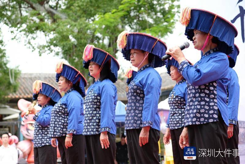 活动现场,鼓乐齐鸣,喜庆的大鹏婚俗展演在古城中穿梭,“新人”身着传统中式礼服,还原大鹏婚礼“接亲”、“迎亲”、“祭拜”等习俗,尊传统礼制,展现了“栏门”“行礼”“哭嫁”等仪式,将大鹏婚俗文化展现得淋漓尽致,融入其中的游客“沉浸式”体验当地婚俗风情。现场还上演非遗节目,其中最为吸睛的当属大鹏山歌《地名海鲜歌》,台上高歌献唱的演员均为当地居民,平均年龄65岁。记者了解到,大鹏山歌于2012年被广东省列入省级非物质文化遗产名录。