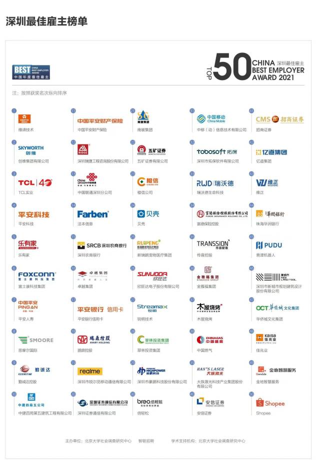 1、 “2021年度最佳雇主”奖的优秀企业(50家)