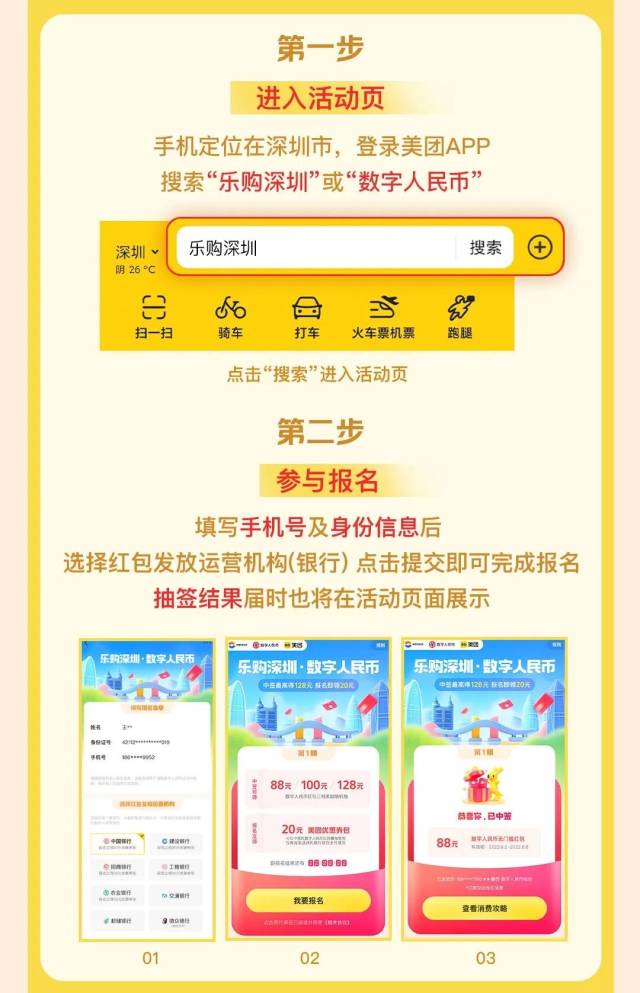 5月30日起,深圳市商务局联合8家银行通过美团平台发放“乐购深圳”3000万元数字人民币红包,单个红包分为88元、100元、128元三款,覆盖线上线下消费场景,为市民带来超值大礼包!