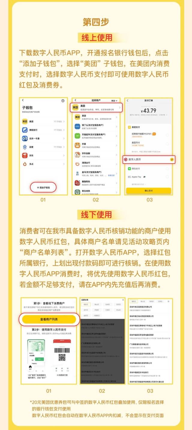 下载数字人民币App,开通报名银行钱包后,点击“服务-添加子钱包”,选择“美团”子钱包。在美团App内消费支付时,选择“数字人民币”支付即可使用数字人民币红包及消费券抵扣,抵扣详情于数字人民币App内显示。(20元美团优惠券包可与中签数字人民币红包叠加使用,每单可使用一张5元无门槛优惠券,仅限报名选择的银行钱包支付使用)。