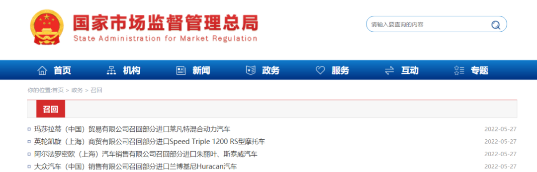 日前,大众汽车(中国)销售有限公司根据《缺陷汽车产品召回管理条例》和《缺陷汽车产品召回管理条例实施办法》的要求,向国家市场监督管理总局备案了召回计划。自2022年5月27日起,召回2021年11月5日至16日期间生产的部分进口兰博基尼Huracan系列汽车,共计7辆。