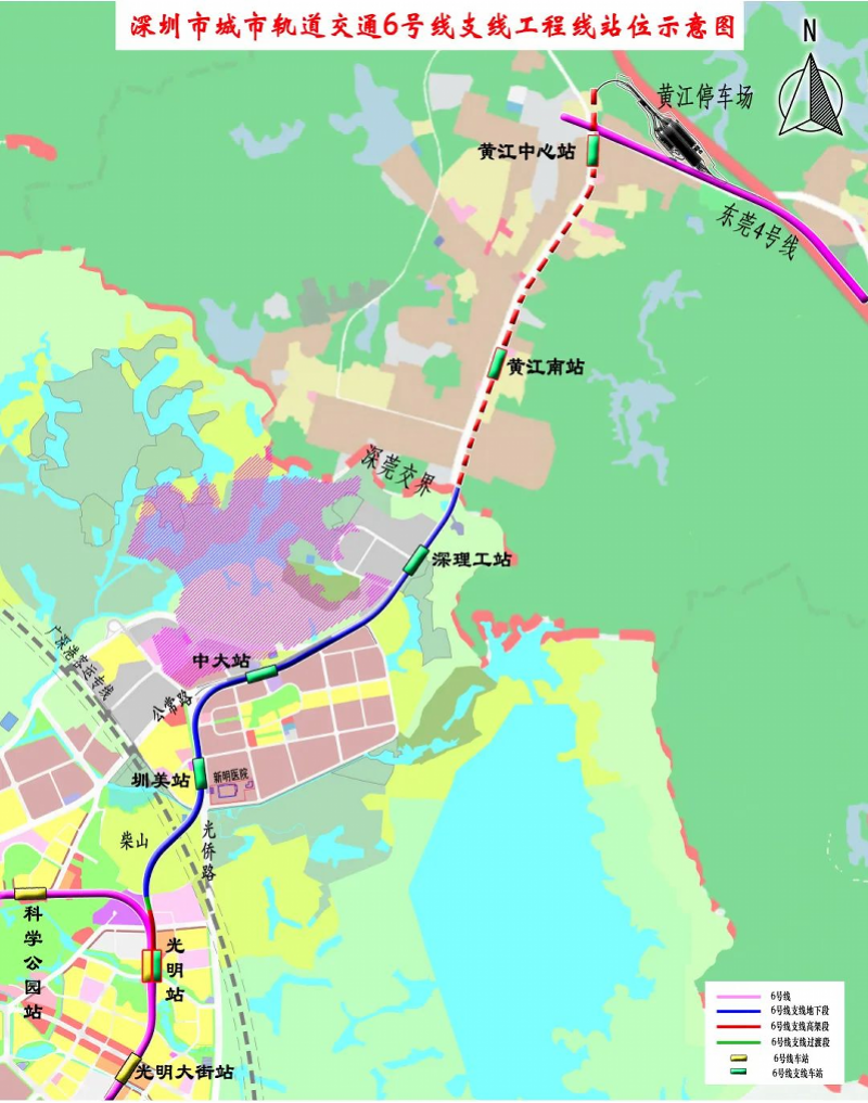 记者了解到,6号线支线起自光明区6号线光明站,止于深莞边界,全长约 6.13 km,共设 4 站 4 区间。站点为:光明、圳美、中大、深理工。其中,光明站为6号线支线与6号线的换乘站。