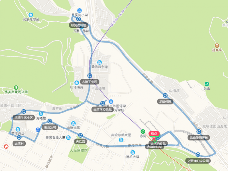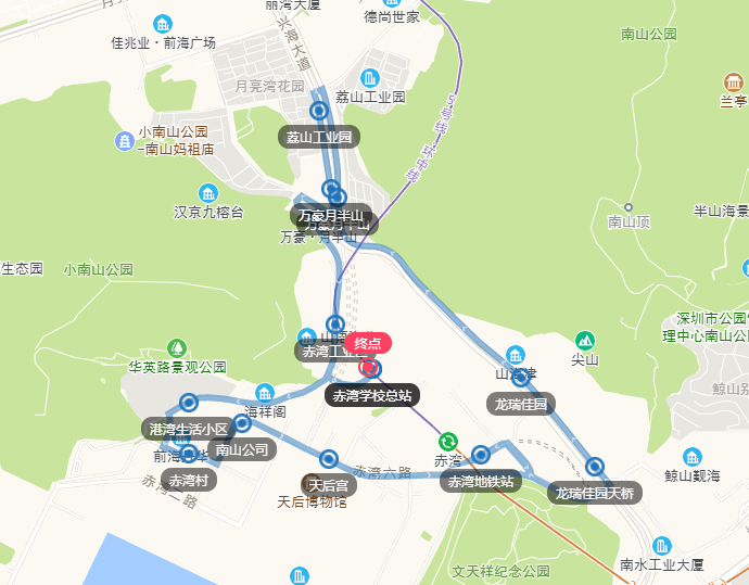 途经站点依次为“港湾生活小区、赤湾村、南山公司、天后宫、赤湾地铁站、龙瑞佳园天桥、龙瑞佳园、万豪月半山、荔山工业园、万豪月半山、赤湾工业区”等11个单边公交停靠站。