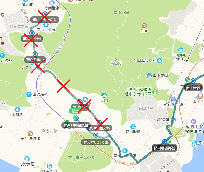 赤湾地铁站、天后宫、南山公司、赤湾村、港湾生活小区、赤湾学校总站、赤湾工业区、月亮湾山庄、龙瑞佳园、龙瑞佳园天桥、文天祥纪念公园、赤湾地铁站