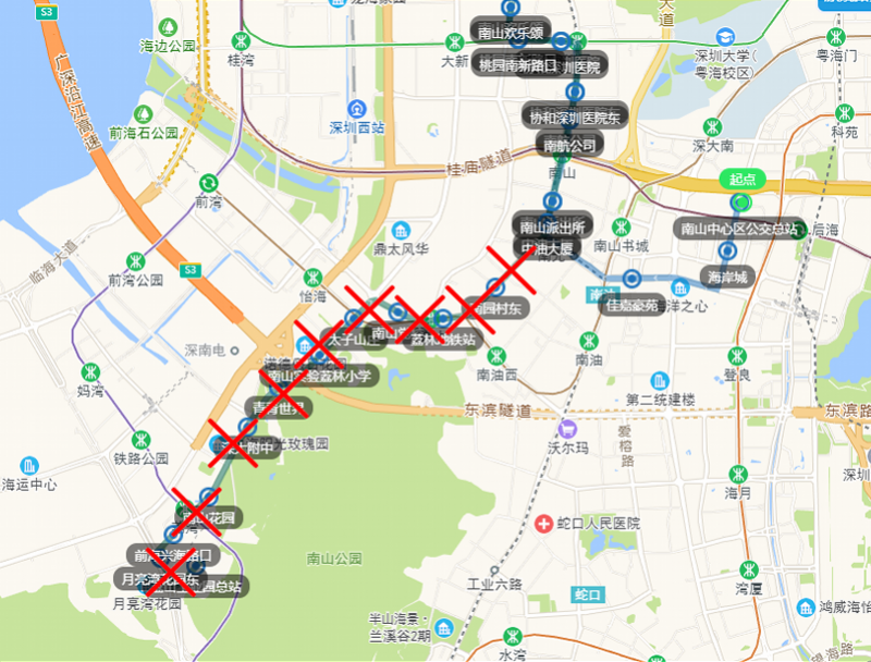 双方向取消“月亮湾花园东、前海兴海路口、南山花园、深大附中、青青世界、南山实验荔林小学、南山党校、荔林地铁站、南园村东”等9对公交停靠站,增加“蛇口人民医院、蛇口体育中心、花果山、南水村史博物馆、海昌街、南海意库、新时代广场、蛇口港地铁站、招港大厦、招商港务”等10对公交停靠站。