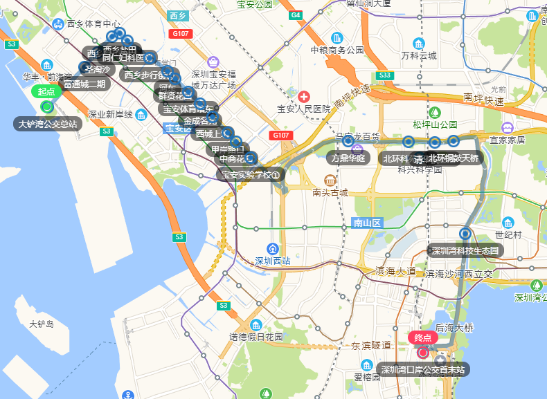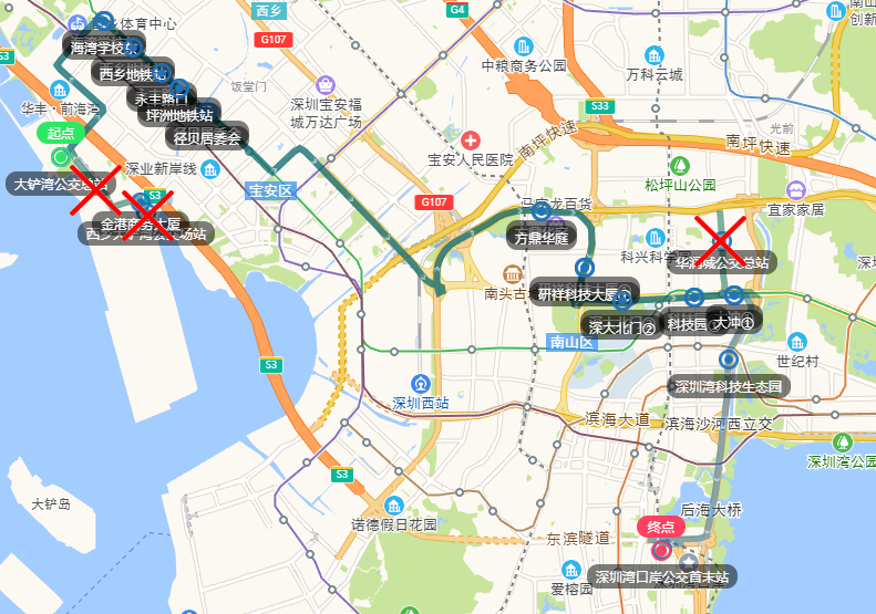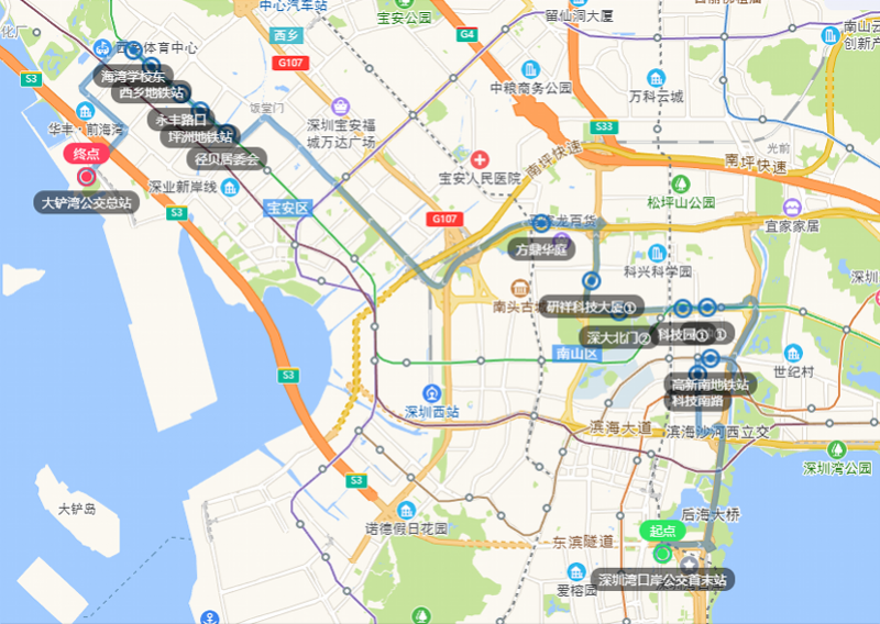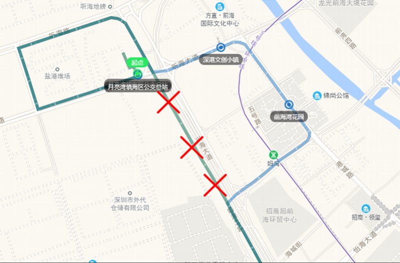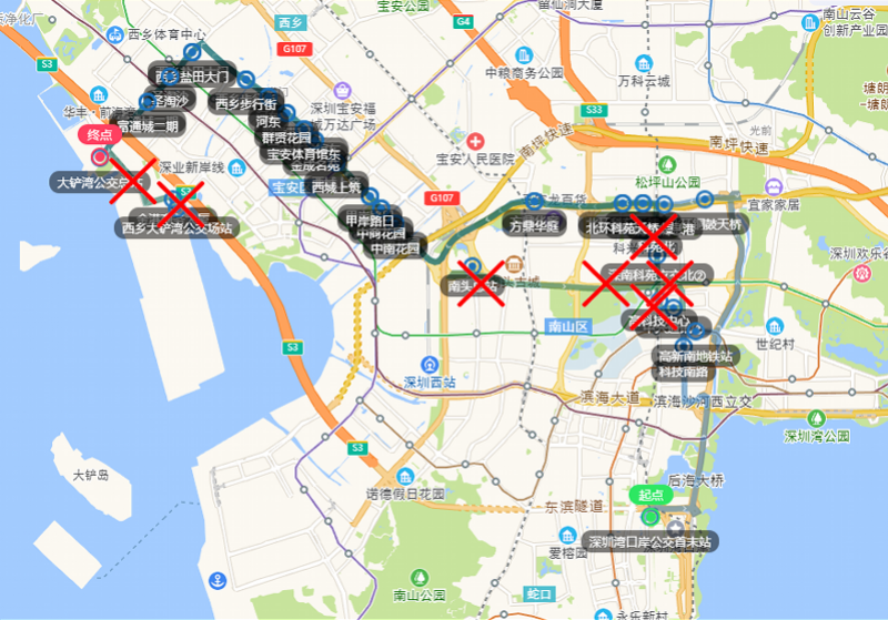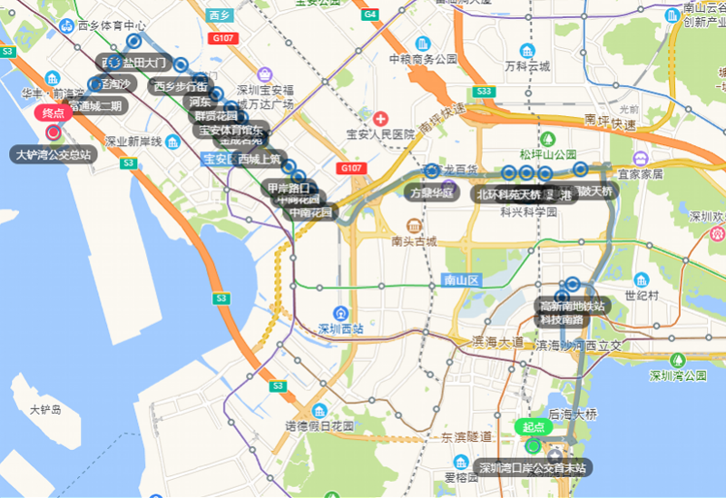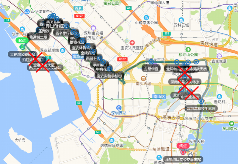 往深圳湾口岸公交首末站方向增加“深港文创小镇、前海湾花园”等2个单边停靠站。