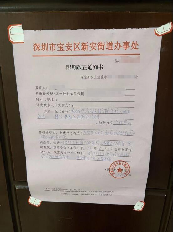 在西城品阁顶楼8楼,记者发现,8楼一户人家门上贴着宝安区新安街道办事处“限期改正通知书”。