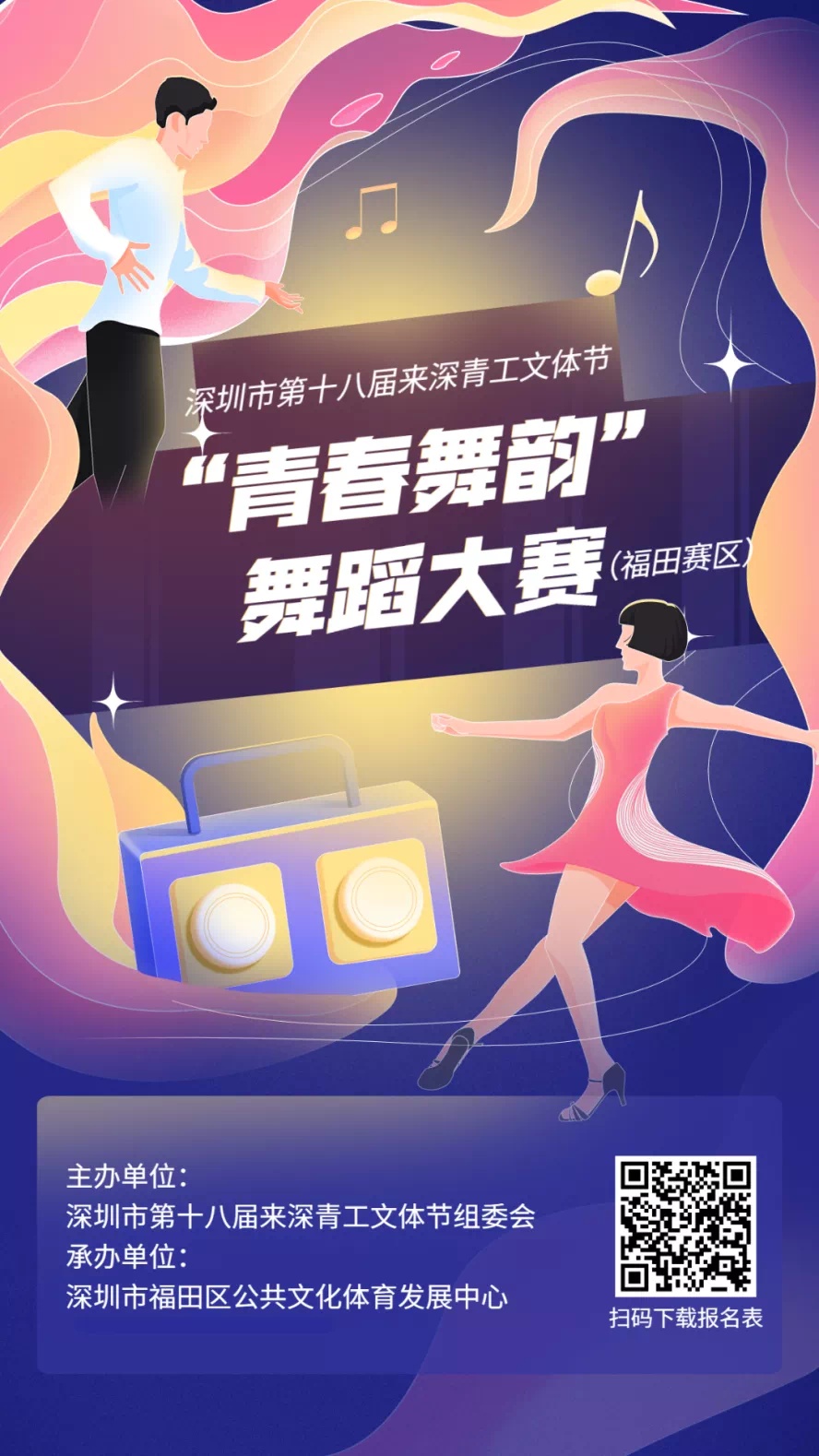 为丰富对来深青年的公共文化供给,体现城市人文关怀,推动建设优质、普惠、可持续的公共服务保障体系,展示新时代新青年积极向上的良好形象,2022年5月-8月,深圳市迎来了第十八届来深青工文体节。目前,深圳市第十八届来深青工文体节“青春舞韵”舞蹈大赛(福田赛区)正在火热报名中,你有才,就快来秀吧。