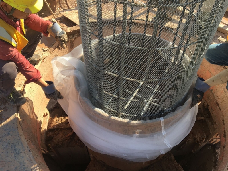 项目基坑支护采用咬合桩+锚索的形式,为了减少普通锚索对周围市政道路施工的影响采用可回收锚索技术——将钢绞线回收再利用,可以减少资源浪费,降低施工成本,削弱对周边环境的影响。