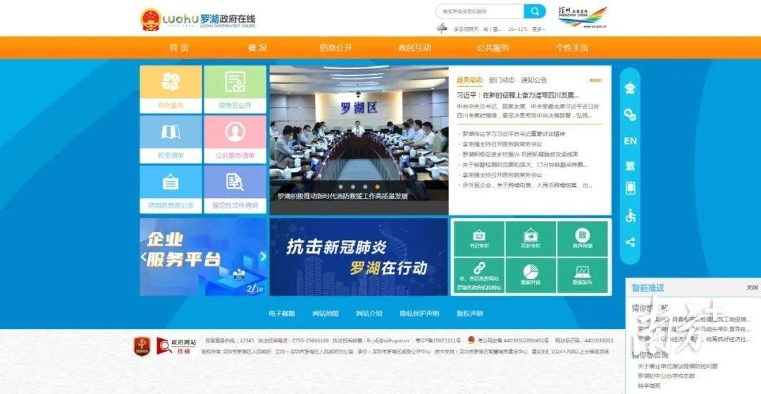 积极发挥政府网站作为政务公开第一平台和政务服务第一专窗,强化公开、立足便民、保障高效,推动“标准化公开+个性化服务”方式,全力推出精准公开和智能服务。新冠肺炎疫情发生以来,开设“抗击新冠肺炎,罗湖在行动”中英文专题,主动公开疫情防控信息;依托“双周发布”,开展“在线访谈”,不断提升行政决策公众参与,强化政策解读精准高效,全面助力疫情防控和复工复产。