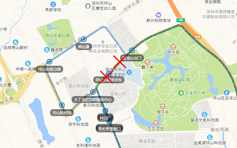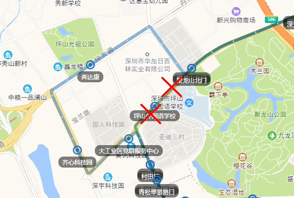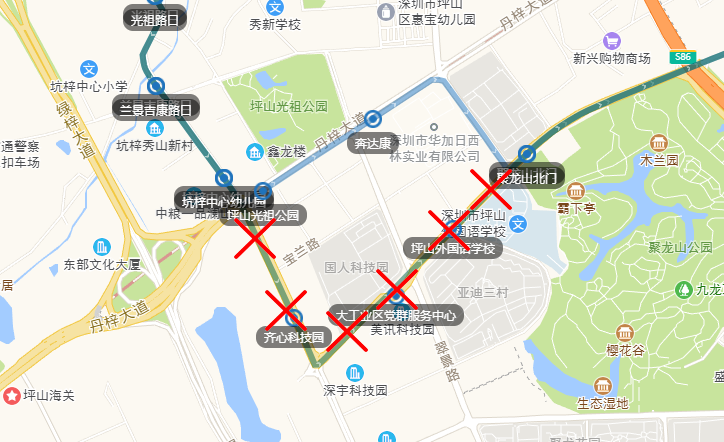 双方向取消“坪山外国语学校、奔达康、坪山光祖公园”等3对公交停靠站。
