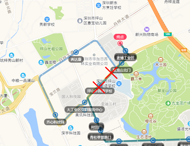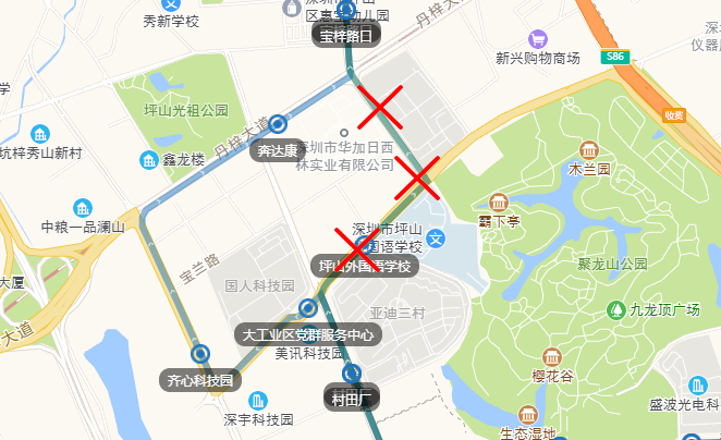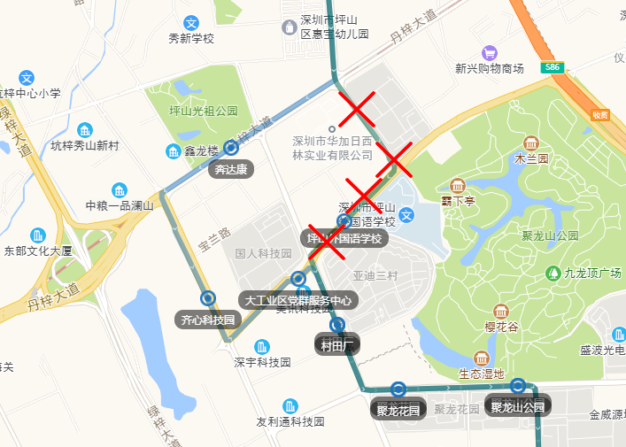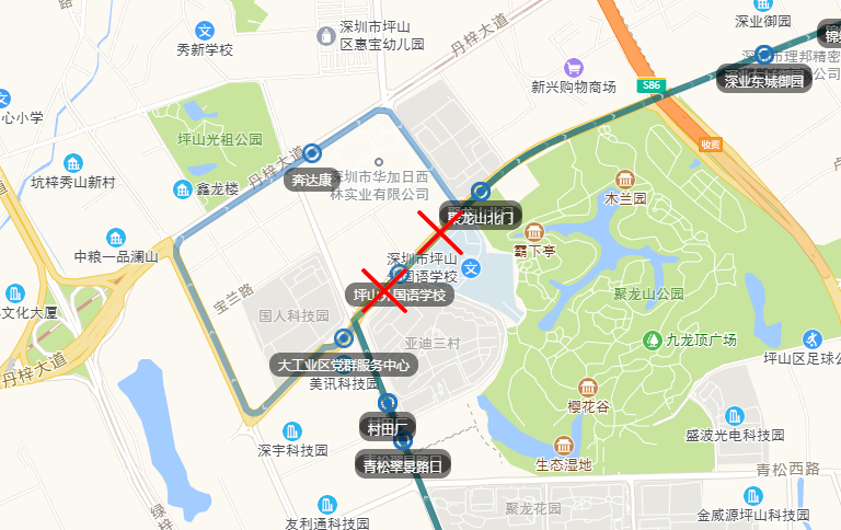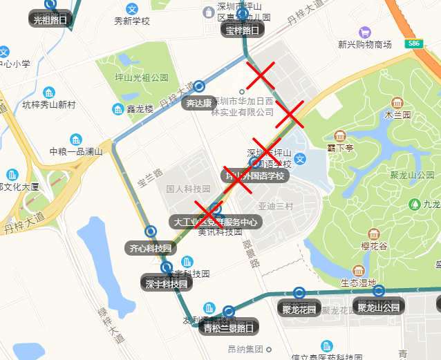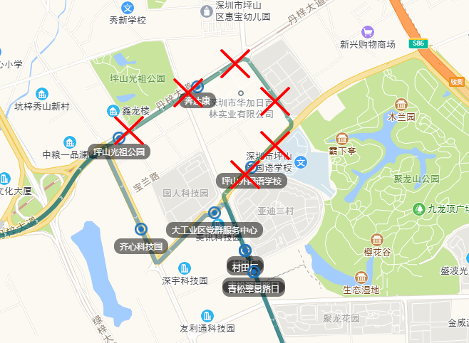 双方向取消“大工业区党群服务中心、齐心科技园、坪山外国语学校”等3对公交停靠站。