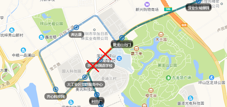 双方向取消“大工业区党群服务中心、坪山外国语学校”等2对公交停靠站。