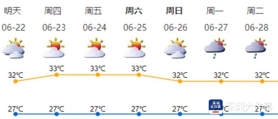 22-25日,深圳(含深汕)以多云到晴天为主,天气炎热,最高气温32-33℃,中北部及人口密集区可达34℃或以上。