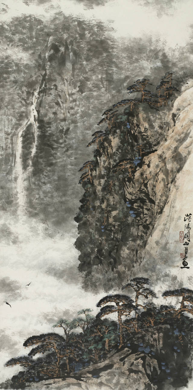 关山月《飞瀑响空山》 138x68.5cm 纸本设色 1980年 关山月美术馆藏