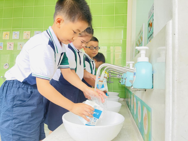 中山大学深圳附属学校设置专门的牛奶盒回收桶,大口径大标识方便识别。成立垃圾分类监督小岗位,让学生轮流在课间负责监督巡查,让每位同学都成为垃圾分类的受益者和管理者。