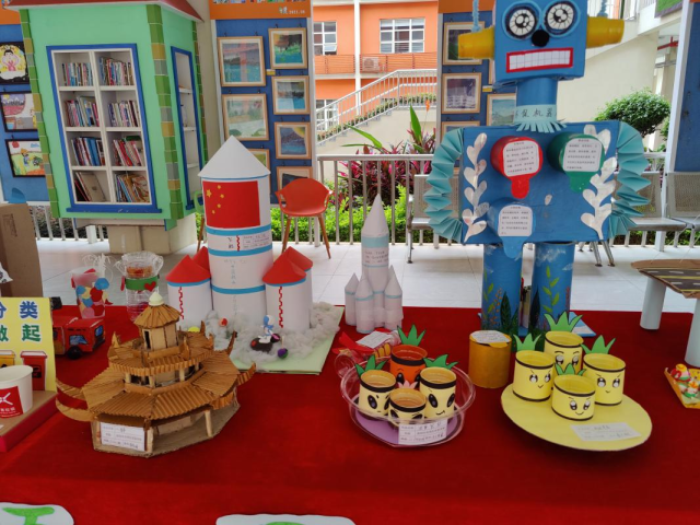 光明区马田合欣幼儿园更是充分发挥每一个物品的重要性,引导小朋友们和老师、家长一起查找各种资料,让每一个物品可再次被使用。如将废弃快递纸皮加入自己的想象力和创造力改造成可穿戴、可观赏的模型,改造身边的“废物”变“废”为“宝”。