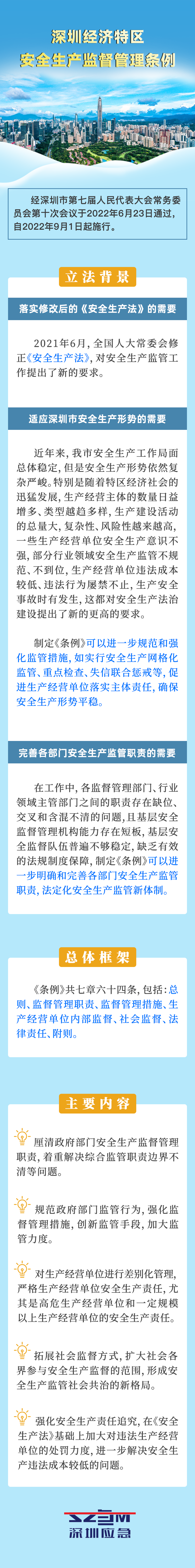 《深圳经济特区安全生产监督管理条例》(以下简称《条例》)将于9月1日起实施。在与新修改的《中华人民共和国安全生产法》做好衔接的基础上,深圳对安全生产监管提出哪些创新要求,来筑牢法治根基?