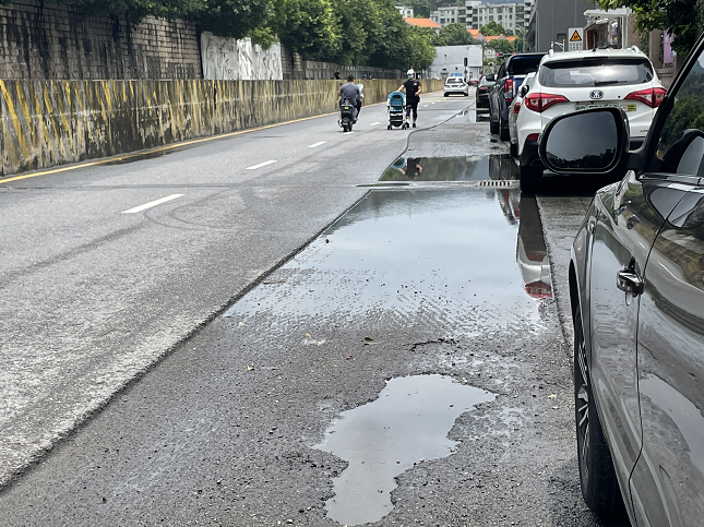 也有不少的居民反映走在行车道上也是迫不得已,由于这条路段的人行道,中间有一段比较窄,人流量高峰期的时候只能容纳两个人的身位,不少行人会选择走在路面的坑槽上,然而雨天路面湿滑,这条路又正好在小区进出口前,已经发生了好几起小区居民因为雨天视线受阻,没有注意脚下的路从而被坑槽绊倒的事故。